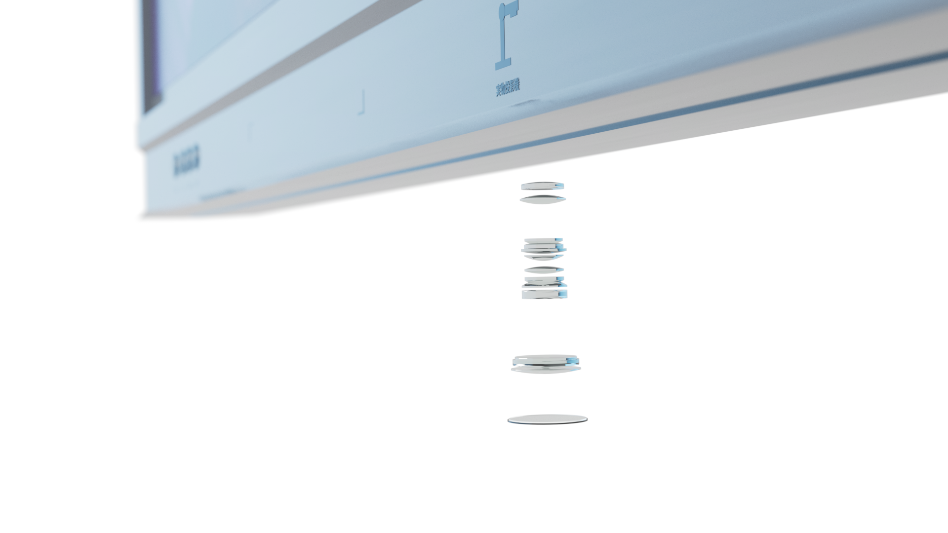ミライタッチBizの持つ独自機能のひとつとして、下向き内蔵カメラ(実物投影機)の機能が搭載されている点が挙げられます。これは特許を取得している独自の機能であり、カメラを別に用意する手間なく、紙の資料や実物をすぐに画面に映し出し、そのうえに書き込みを行うことができます。